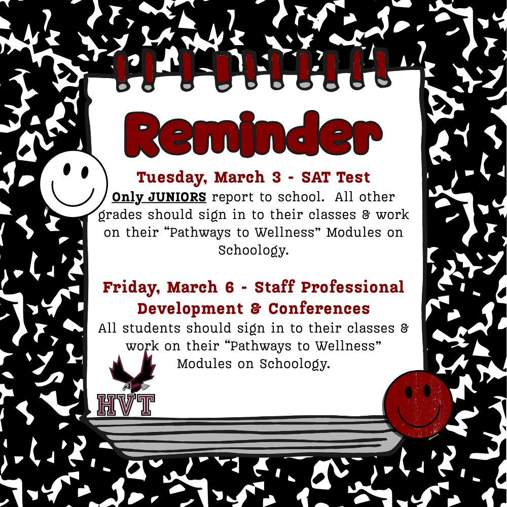 Only JUNIORS report to school. All other grades should sign in to their classes & work on their “Pathways to Wellness” Modules on Schoology.