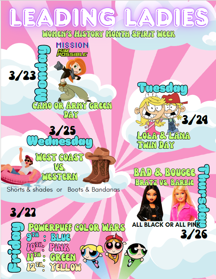 Leading Ladies Spirit Week Celebrate Women's History Month Spirit Week with us! Check the graphic posted for more details. March 23-27! Published March 11, 2026 Print